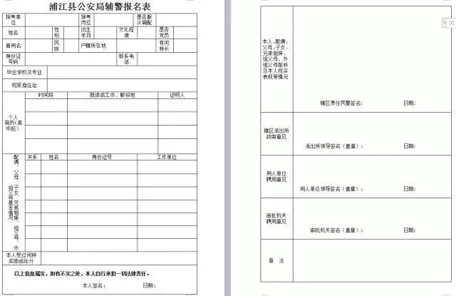 - 因工作需要,浦江县公安局面向社会公开招聘辅警,现将有关事项公告如下:一、招聘计划计划招聘辅警103人,具体岗位、招聘人数、资格条件等详见《浦江县公安局各单位辅警需求表》(附件1)。二、招聘条件(一)基本条件1.拥护宪法,遵守法律法规,品行端正,热爱公安事业;2.中国国籍,年龄18周岁至35周岁(1981年10月3日至1999年10月3日期间出生),个体形象好;3.文职辅警具有本科以上文化程度;勤务辅警具有大专以上文化程度;4.具有履行职责的身心条件和工作能力;5.同等条件下,优先招聘警察类或政法类院校毕业生、具有岗位所需专业资质或专门技能人员、退役士兵、见义勇为积极分子和先进个人。(二)下列情形不得报考:1.受过刑事处罚、治安管理处罚或者涉嫌违法犯罪正在接受调查尚未作出结论的;2.有较为严重的个人不良信用记录的;3.因违纪违规被开除辞退解聘的;4.本人家庭成员或近亲属被判处刑罚的;5.本人或家庭成员、近亲属参加非法组织、邪教组织或从事其他危害国家安全活动的;6.其他不适合从事辅警工作的。三、招聘程序(一)报名初审1.报名时间:2017年10月10日-10月11日(上午08:30-11:30,下午14:00-17:00)。2.报名地点:浦江县公安局政治处1002会议室(浦江县仙华街道恒昌大道101号),联系电话:0579-88189806、88189805。3.报名时携带材料:浦江县公安局辅警报名表(附件3),本人身份证、户口簿、毕业证书、士兵证等相关证件(证明)原件及复印件,表彰荣誉证件原件及复印件,近期1寸免冠正面彩照3张。4.对报考人员进行资格条件审查。5.对符合报考资格条件人员发放准考证(发放准考证的时间和地点另行通知)。(二)笔试时间:2017年10月15日上午9:00—11:00地点:浦江县公安局附楼三楼会议室考试范围包括《2017年浙江省各级机关单位招考公务员公共科目考试大纲》相关内容以及《刑法》、《刑事诉讼法》、《治安管理处罚法》、《人民警察法》等公安基本法律法规。报考人员必须同时携带准考证和有效期内的第二代居民身份证,按时参加考试。笔试成绩满分为100分。笔试结束后,由浦江县公安局统一划定笔试合格分数线。(三)体能测试报考特勤岗位的还需参加体能测试,根据笔试成绩,在笔试合格人员中从高分到低分按1:1.5确定体能测试对象。不足规定比例的,按实际人数确定。体能测试时间、地点另行通知,标准详见附件2。入围人员持本人有效期内的第二代居民身份证参加体能测试,报考人员放弃或不按规定时间、地点参加的,不再递补。(四)面试笔试合格分数线以上人员(特勤岗位还需体能测试每个单项都合格),发给面试通知书,参加面试。面试时间、地点另行通知。入围面试的人员放弃面试资格的,相关职位不再递补。面试成绩满分为100分,合格分为60分。面试不合格者,不能列入体检对象。(五)体检面试结束后,将笔试成绩、面试成绩合成计算总成绩。若总成绩相等,以笔试成绩高的排位在前。总成绩的计算公式为:总成绩=笔试成绩÷2+面试成绩÷2根据总成绩从高分到低分按招聘计划的1:1比例确定体检对象。体检:时间、地点另行通知。体检项目和标准参照《公务员录用体检通用标准(试行)》执行,体检费用由报考人员承担。报考人员不按规定的时间、地点参加体检的,视作放弃体检。放弃体检或体检结论不合格的,由浦江县公安局在相应岗位面试合格人员中按总成绩从高分到低分递补。(六)考察(政审)体检合格人员入围考察(政审)。考察(政审)内容包括政治思想、道德品质、能力素质、学习及工作表现、遵纪守法、廉洁自律等方面,重点考察报考人员是否存在不得报考的情形,以及核实是否符合规定的报考条件。考察(政审)结果仅作为本次招聘的依据。(七)公示与聘用考察(政审)结束后,对拟聘用人员名单予以公示。公示合格人员,由浦江县公安局与其签订劳动合同。四、注意事项(一)报考人员在报名资格审查中提交的所有材料应当真实、准确、有效。凡提供虚假信息和材料获取报考资格的,或有意隐瞒本人真实情况的,一经查实,即取消报考资格。(二)体能测试中有一项不达标的,视为体能测试不合格。(三)对招聘公告中关于报考专业、学历、学位、资格条件及备注等信息的咨询,可直接拨打0579-88189805和0579-88189806进行电话咨询。(四)工资及福利待遇根据岗位不同分别为3.5-6万/年(含五险一金)。(五)本公告未尽事宜,由浦江县公安局政治处负责解释。浦江县公安局2017年10月03日
