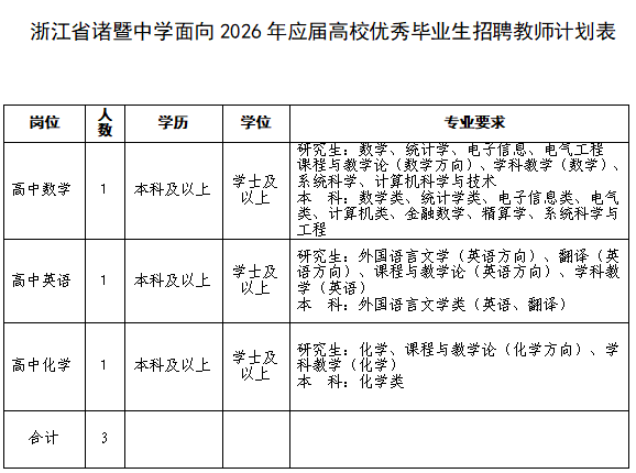 二、招聘计划 本期招聘共推出3个教师岗位,具体设置详见《浙江省诸暨中学面向2026年应届高校优秀毕业生招聘教师计划表》(附件1)。